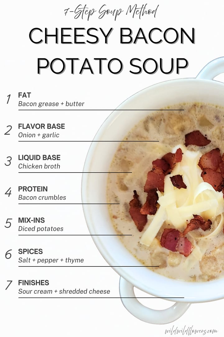 - Stir in half-and-half or milk and heat gently. Remove from heat and stir in shredded cheese until melted and smooth. Ladle into bowls and top with a spoonful of sour cream, extra bacon, and a sprinkle of herbs or cheese.
