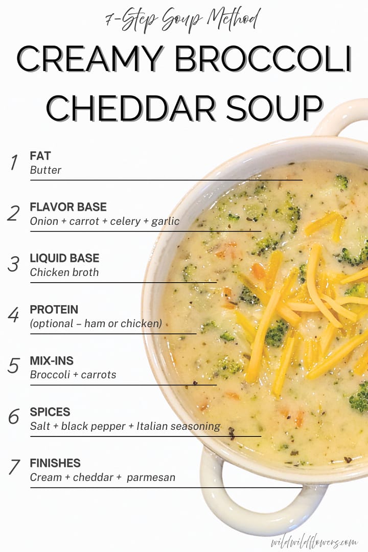 This recipe follows my 7-Step Soup Method, which makes soup-making simple by breaking it into foolproof building blocks: fat, flavor base, liquid, protein, mix-ins, spices, and finishes. Once you know the steps, you can swap ingredients and create endless variations. Serve this broccoli cheddar soup with crusty bread, in a bread bowl, or alongside a crisp salad for an easy dinner everyone will love.