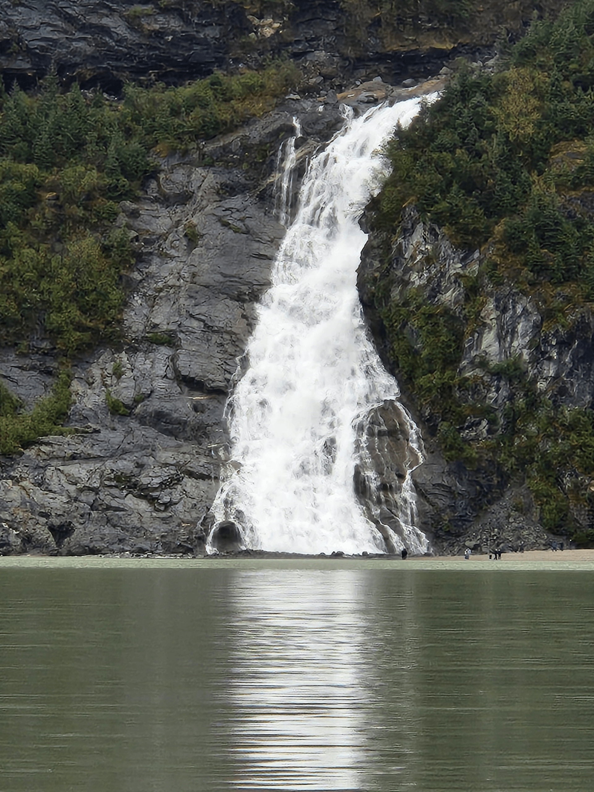 Our excursion was a canoe trek across Mendenhall Lake, paddling through glacial waters and weaving through floating ice to get our canoe to within about 200 yards of Mendenhall Glacier. In iceberg lingo, the bigger chunks — anywhere from the size of a car to a small house — are called bergie bits. The smaller ones, under 16 feet across, are growlers, often a striking blue and sometimes fizzing quietly as ancient air escapes. On canoe paddle back, we stopped at Nugget Falls, a stunning glacial-fed waterfall.