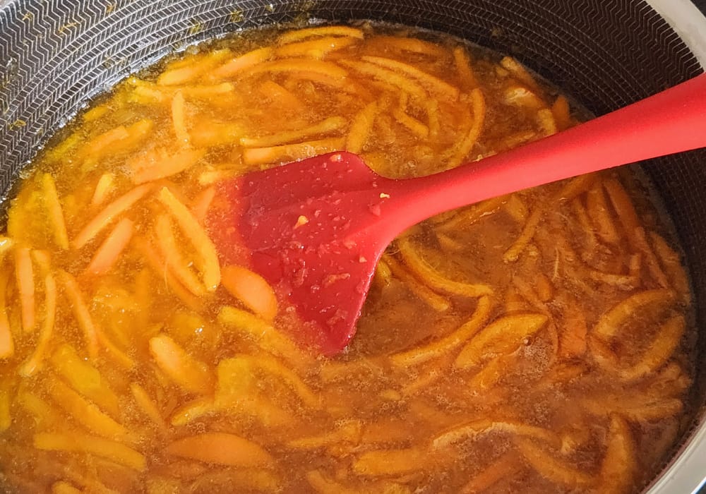 - Simmer.Bring the mixture to a boil over medium heat, then reduce to a gentle simmer. Cook uncovered for about 20 minutes, stirring occasionally, until the peels are tender and the mixture looks slightly translucent.