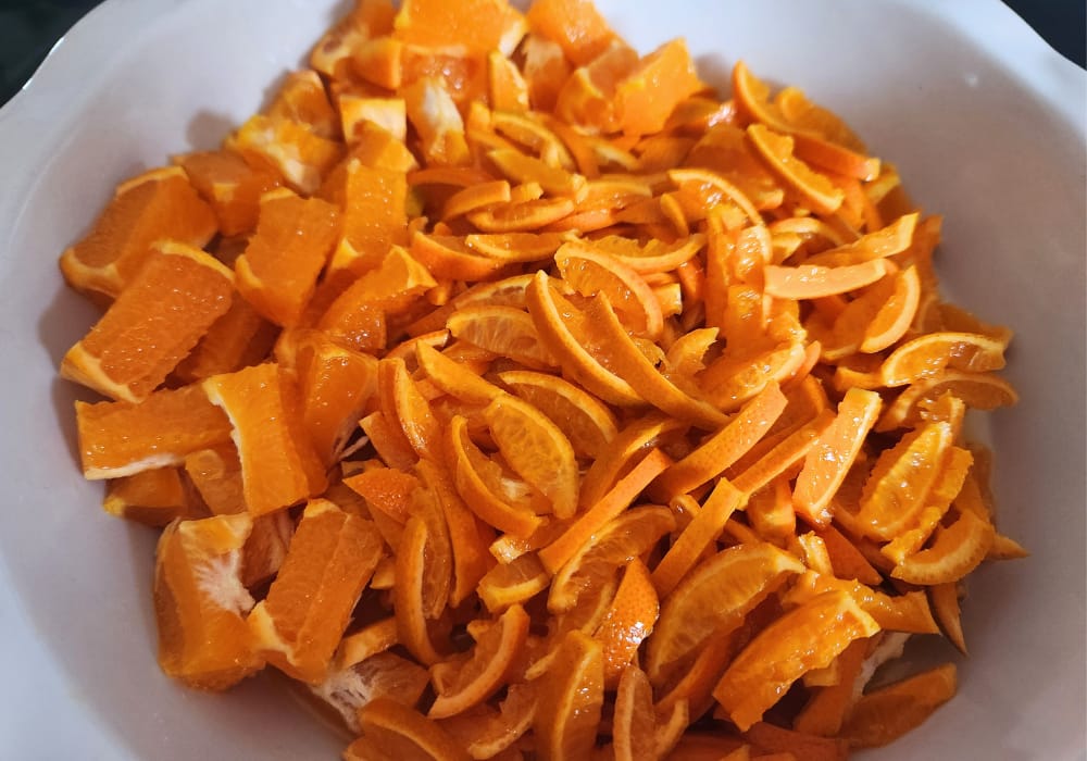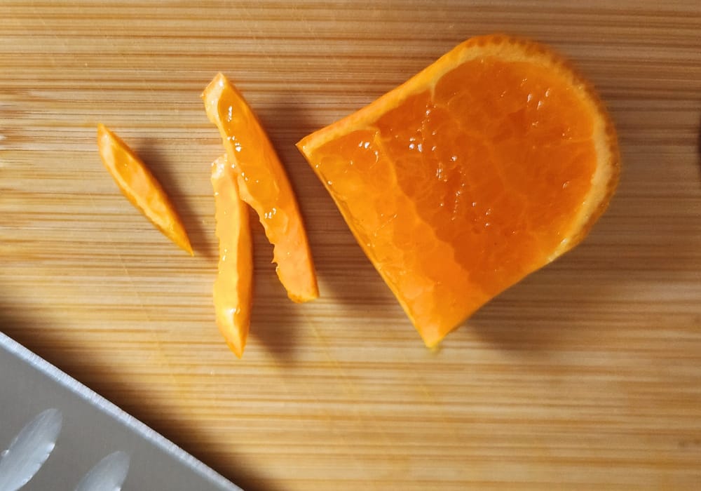 Mandarin peels are naturally thin and tender, so you can use them whole. You do not need to blanch or remove the rind. If using thicker-skinned oranges (like navels or Valencias), blanch the peel in boiling water for a few minutes to soften and remove some bitterness before slicing.